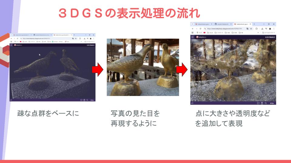 「Babylon.jsとGaussian Splatting」では、3D Gaussian Splattingの概要とBabylon.jsでのデータ編集、3Dデータをブラウザで可視化することによる業務の効率化などを解説(画像はスライド資料より引用)